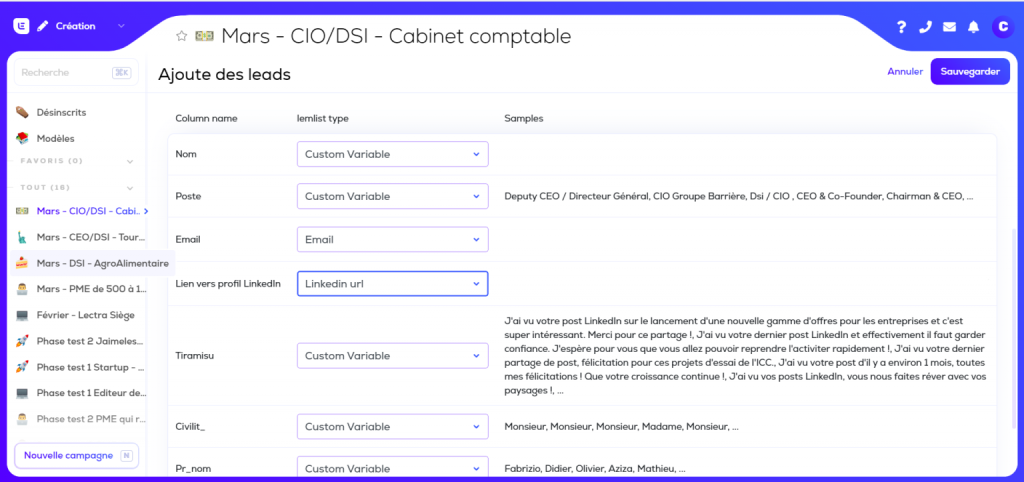 Une fois cette manip réalisée, ma question fut la suivante : Suis-je certain que mes messages vont bel et bien partir ? 🤔 Mon ciblage 🎯 était fait, mon discours 📝 également… Je ne voulais pas tout perdre pour une erreur de manipulation. J’ai donc interrogé Lemlist sur ce point et dans les 10 minutes suivantes… j’avais la réponse ! Lors de l’import de la BDD, il faut bien faire matcher la colonne des liens vers les profils LinkedIn avec la variable “URL LinkedIn”.